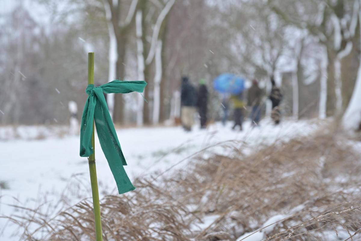 ... trafen sich etwa 20 wetterfest gekleidete Menschen in Linumhorst, um sich bei Wind und Schneetreiben ein Bild von den aktuellen Allee-Sanierungsarbeiten zu machen. Ein Teil der nicht mehr standsicheren Alleebäume wurde Ende Dezember entnommen, Habitatbäume für Wildtiere und Kleinlebewesen blieben erhalten, Stubben wurden gefräst und die Grundlagen für Reisighecken gelegt. Dort, wo im kommenden Herbst neue Bäume gepflanzt werden, steckten die Teilnehmenden grüne Fähnchen in die Erde. Etwa 200 Bäume sind fürs Erste geplant. Beim Hantieren und Wägelchen-Ziehen kamen Fragen auf, die von Gudrun Grimm und Jana Albrecht (Landschaftsförderverein), von Heiko Koeppen (Umweltbeirat) sowie Sabine Nickel-Dietrich (Baumbeauftragte der Stadt Kremmen) beantwortet wurden.